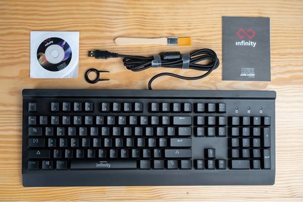 Bên trong hộp cũng tối giản không kém khi chỉ có bàn phím, tấm che bụi bằng nhựa trong, sách đĩa phần mềm. Và Infinity cũng cầu kì cung cấp thêm 1 cây chổi vệ sinh cùng với phụ kiện vốn dĩ là mặc định với bàn phím cơ đó là dụng cụ gỡ phím (key puller).