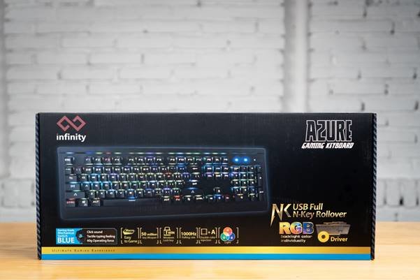 AZURE là sản phẩm bàn phím cơ đầu tiên của Infinity, thoạt nhìn nó có thông số rất “ngon” có thể kể đến như case nhôm nguyên khối, keycap double shot xuyên LED, BLUE switch,… là một bàn phím cơ hoàn hảo từ thiết kế đến hiệu năng trong tầm giá dưới 2 triệu đồng.