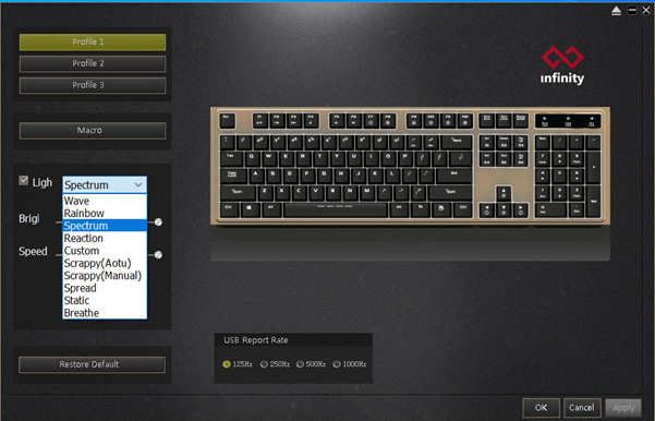 Một chiếc bàn phím mang màu sắc game thủ thì LED là phần không thể không đề cập tới. Như đã nói trong bài, Infinity Azure là bàn phím high profile nên sẽ có hiệu ứng LED tốt hơn các loại phím low profile khác. Phím có khá nhiều chế độ LED, và với phần mềm đi kèm, chúng ta còn có thể set màu LED cho từng phím.