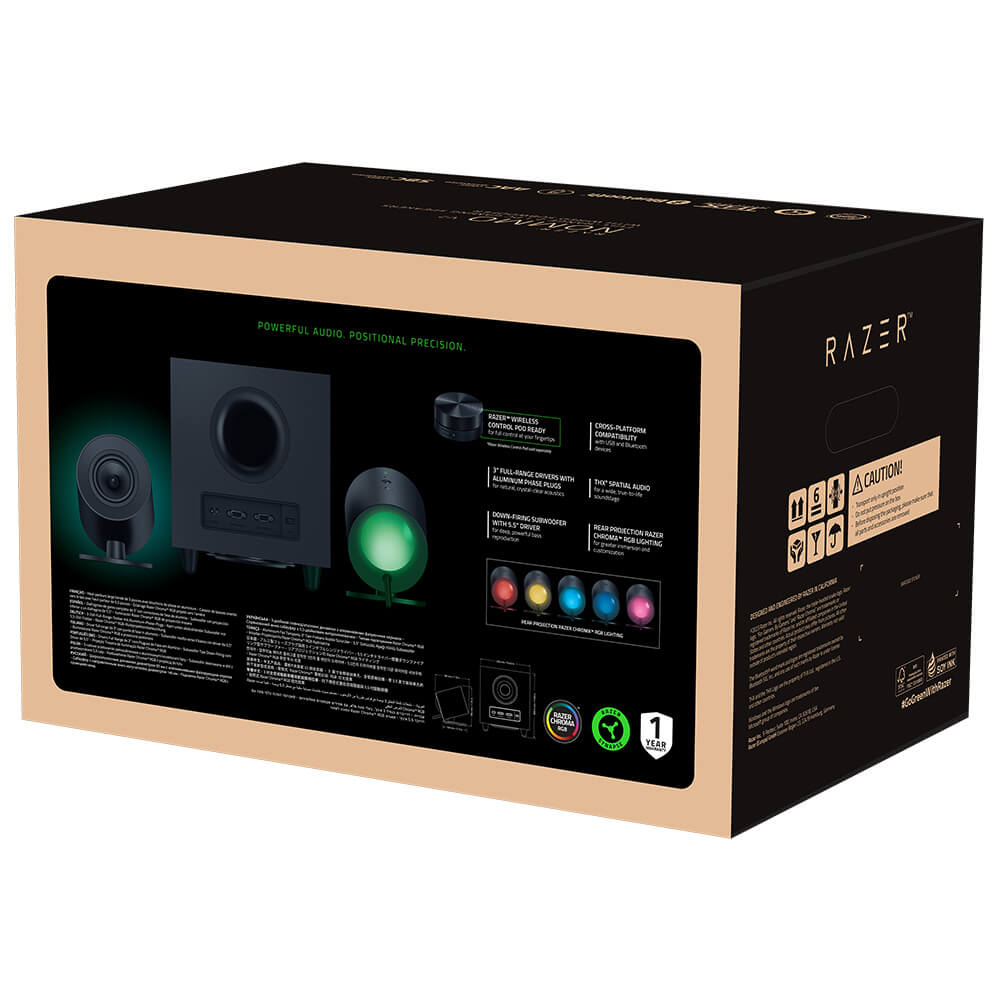 | OTHERS | Rear projection Razer Chroma™ RGB (2 zones) THX® Spatial Audio Wired subwoofer USB audio input Bluetooth 5.3 Custom 10-band EQ Max SPL: 98 dB Toggle PC audio devices (supported via Razer Synapse) |