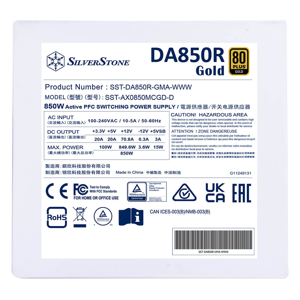 SilverStone DA850R Gold – White – 80 PLUS Gold 850W ATX3.0/3.1 & PCIe 5 Fully Modular Power Supply