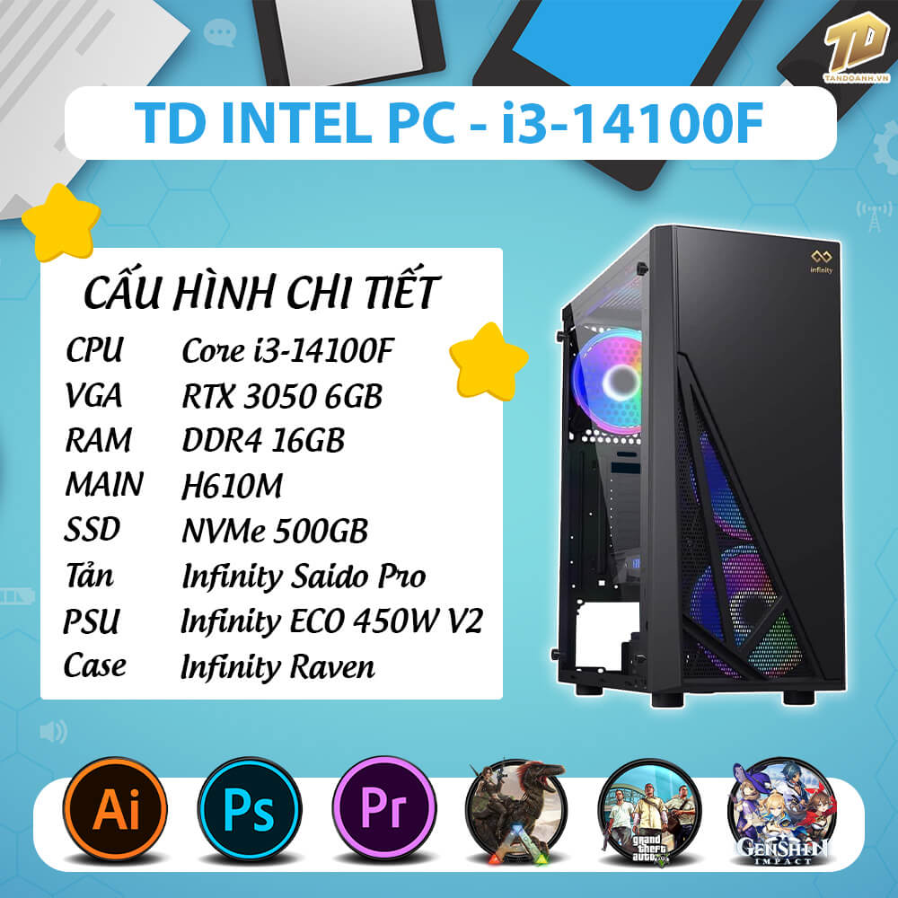 | CPU | Intel Core i3-14100F 4C/8T 12MB Upto 4.7GHz – Socket 1700 ( Hàng nhập khẩu ) |