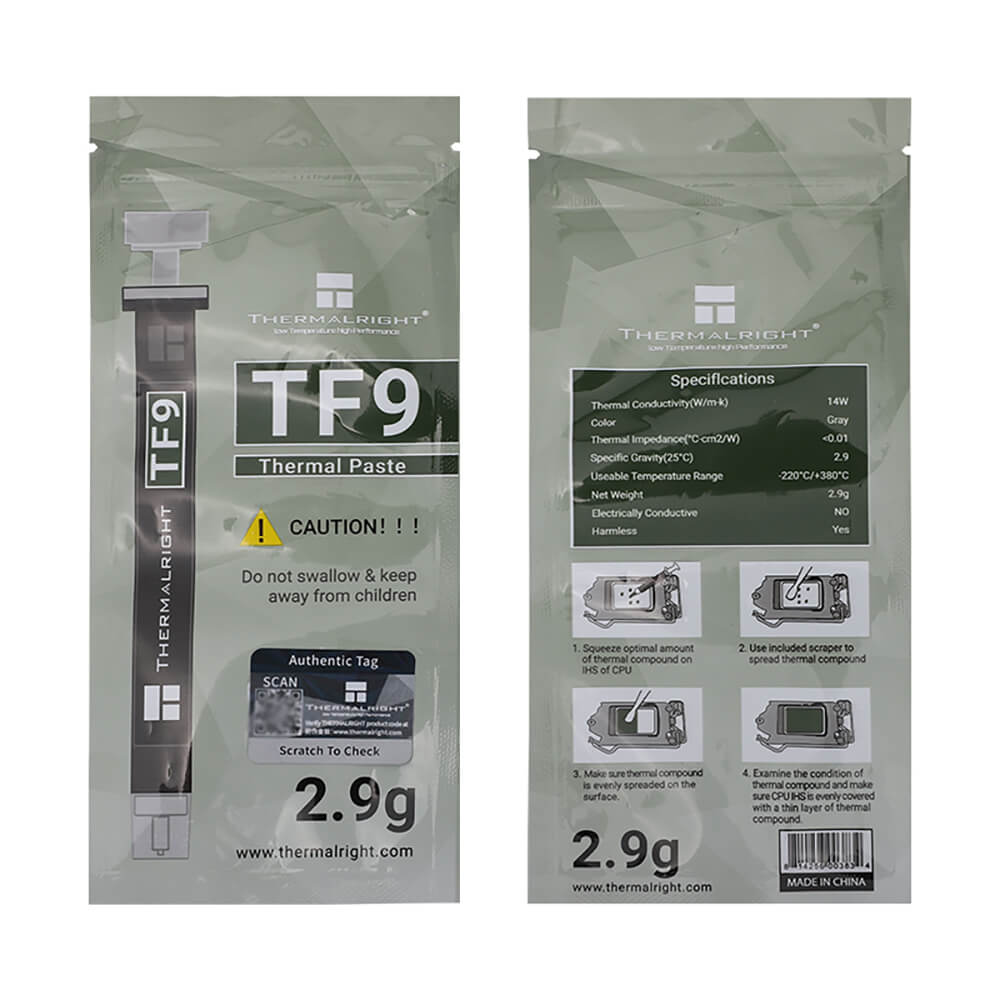 TF9 sử dụng công thức gốc ceramic pha trộn với các hợp chất dẫn nhiệt chuyên dụng, giúp truyền nhiệt nhanh và đều từ bề mặt chip sang tản nhiệt. Thành phần không chứa kim loại lỏng nên an toàn khi sử dụng, đồng thời mang lại hiệu quả ổn định trong thời gian dài.