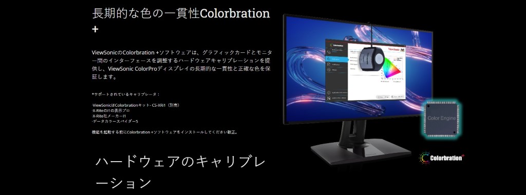 Phần mềm Colorbration+ của ViewSonic cung cấp tính năng hiệu chuẩn phần cứng điều chỉnh giao tiếp giữa card đồ họa và màn hình để đảm bảo tính nhất quán lâu dài và màu sắc chính xác trên màn hình ViewSonic ColorPro.